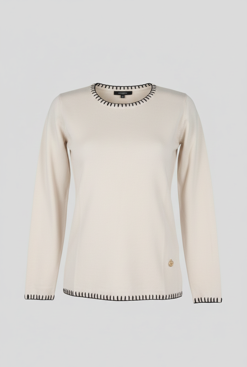 Scopri la Maglia Iris, dove la semplicità della tinta unita incontra un dettaglio sartoriale d'impatto. Il fondo color panna (o ecrù) è il palcoscenico ideale per l'impuntura a vista in nero, un segno grafico che percorre il capo, donandogli carattere e una struttura moderna.