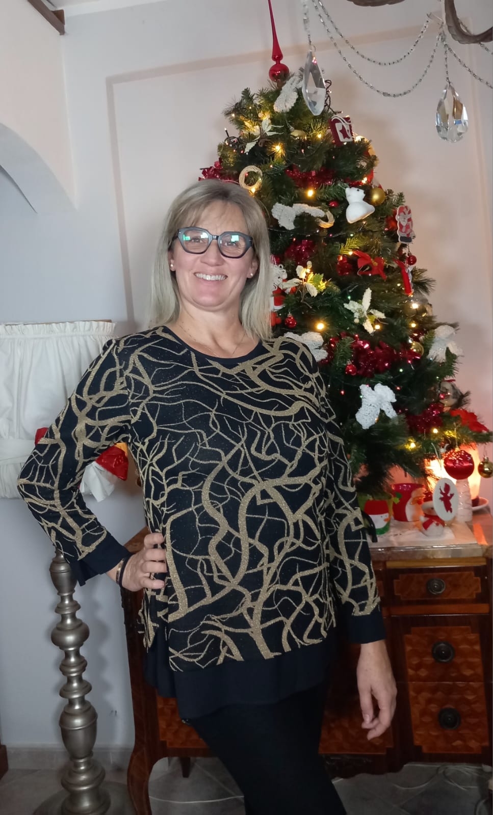 Fai risplendere il tuo stile con la Maglia Oro, un capo che unisce il glamour della fantasia metallizzata alla raffinatezza di un dettaglio inaspettato.