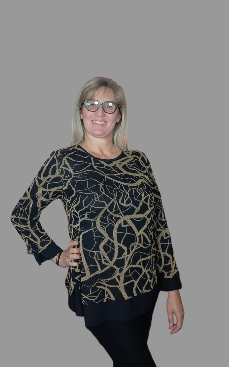 Il tessuto presenta una splendida fantasia nero e oro, offrendo un effetto scintillante ma elegante, perfetto per illuminare i mesi più freddi. Ma la vera sorpresa si trova sul retro: un discreto ma seducente spacco sul fondo della schiena aggiunge un elemento di movimento e modernità.