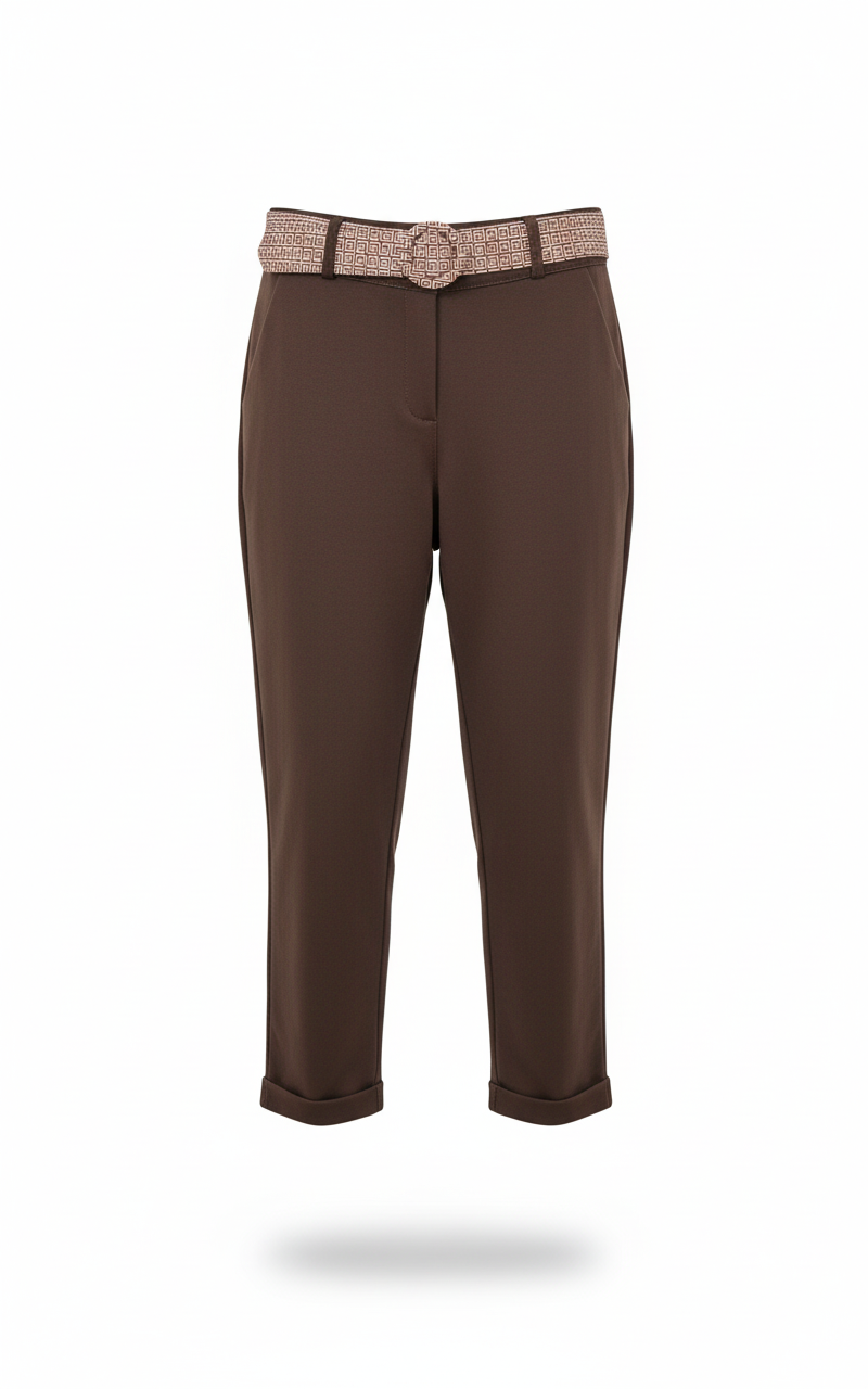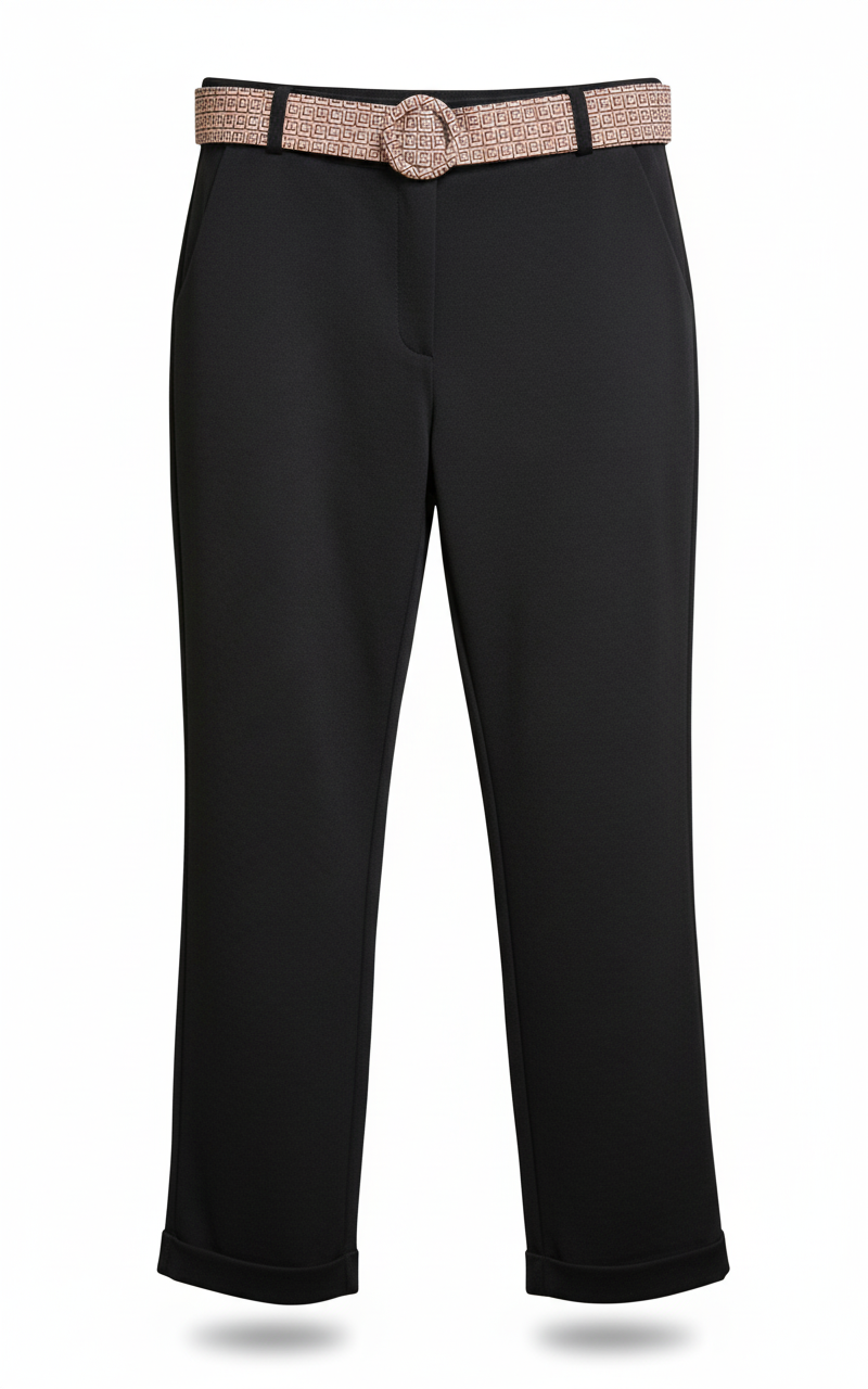 Il design essenziale è arricchito da dettagli funzionali come tasche laterali, chiusura con cerniera e bottone, e la cintura inclusa per definire il punto vita.